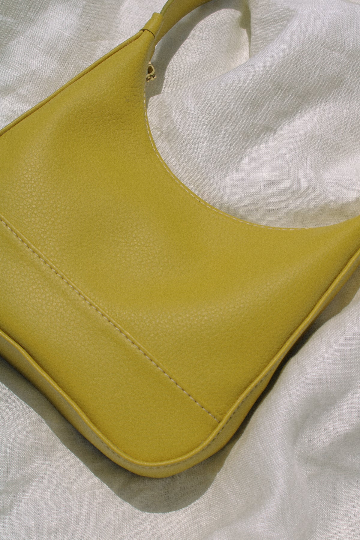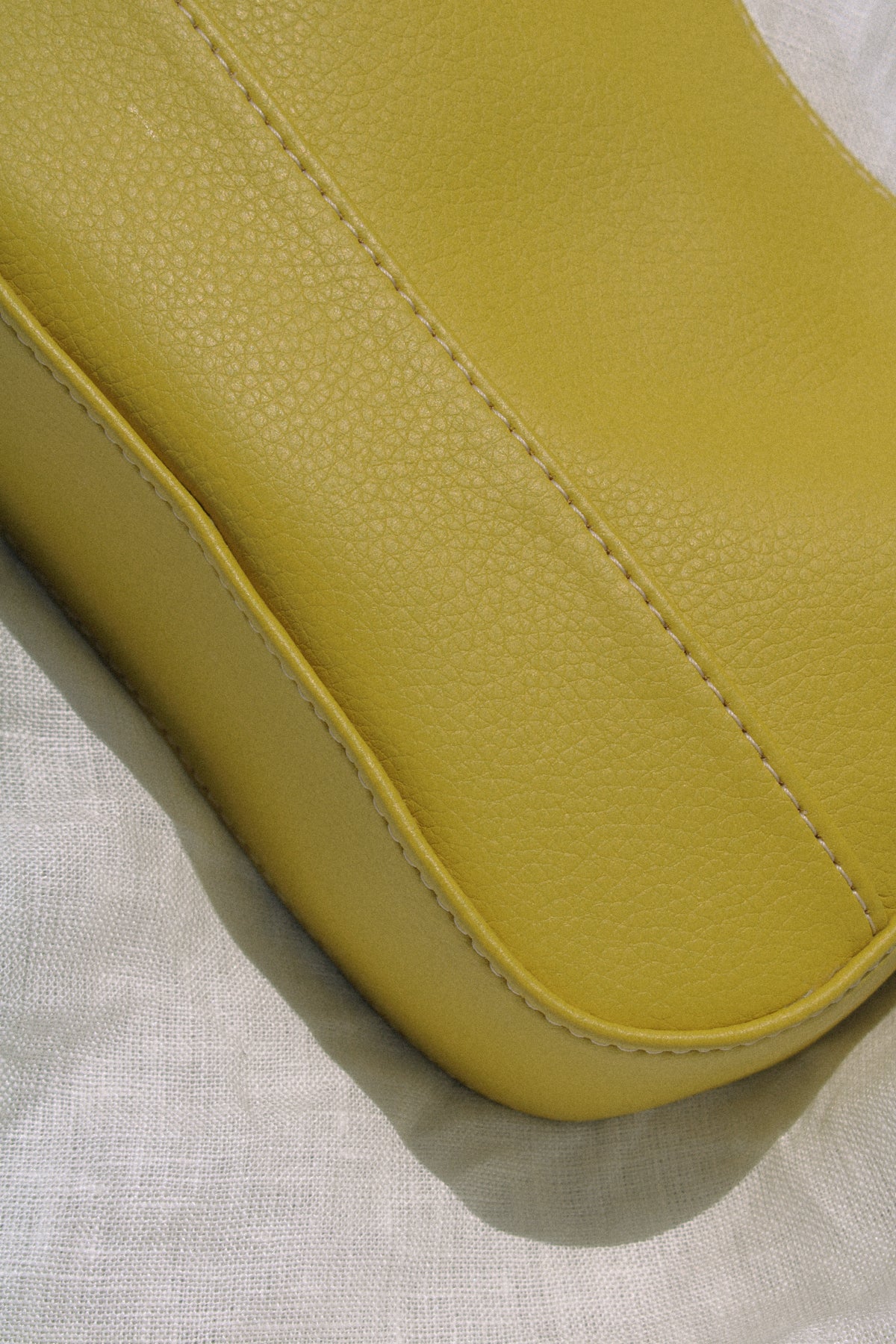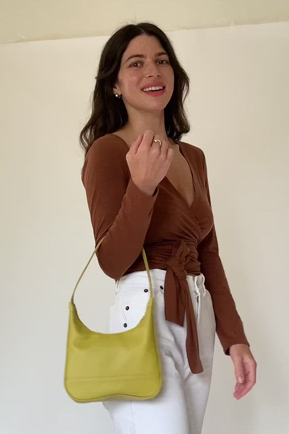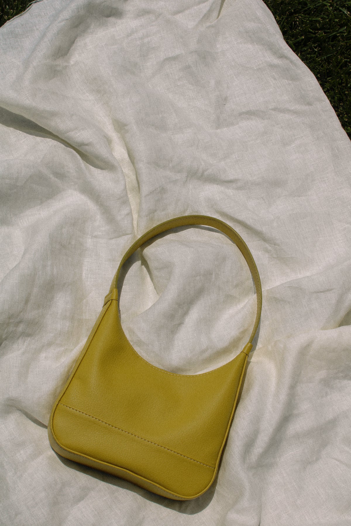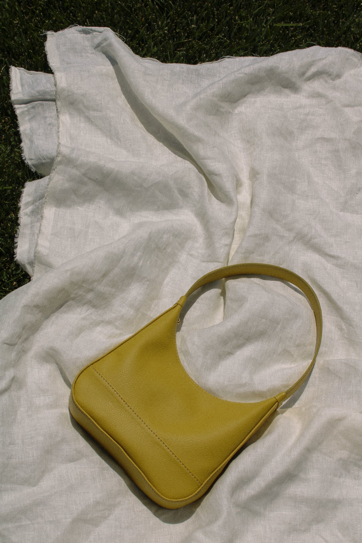 Meet the Frida Shoulder Bag. Inspired by those perfectly compact 90s bags, the Frida is the perfect size and made using deadstock faux leather. Dress up or down, she's universally appropriate for any occasion. Shown here in our Cubanelle color way, a subdued matte lime. The Frida bag is also available in Pebble, Peppercorn, and Sisal. Made sustainably and ethically in Los Angeles by our artisan bag maker, Lidia.