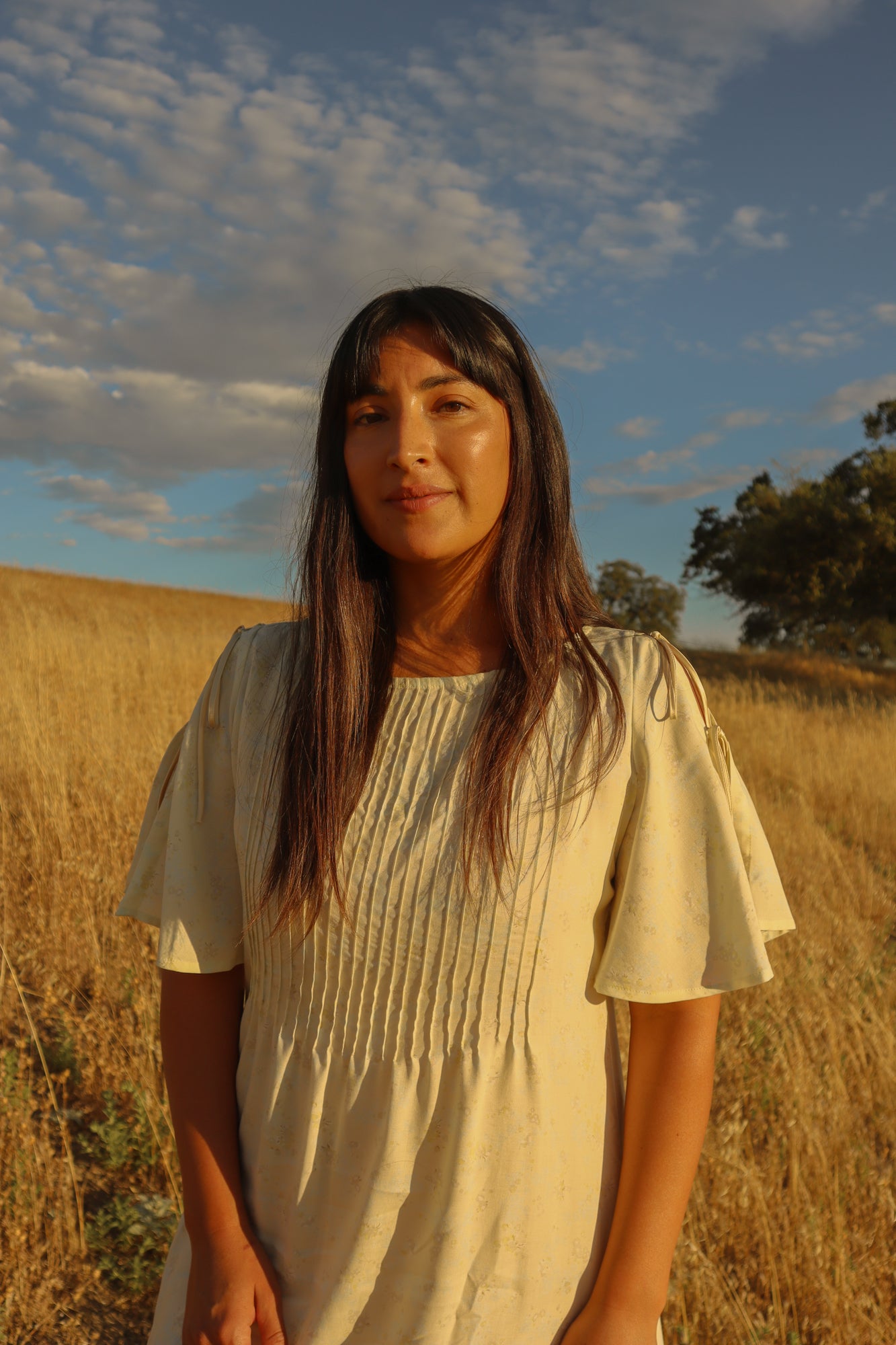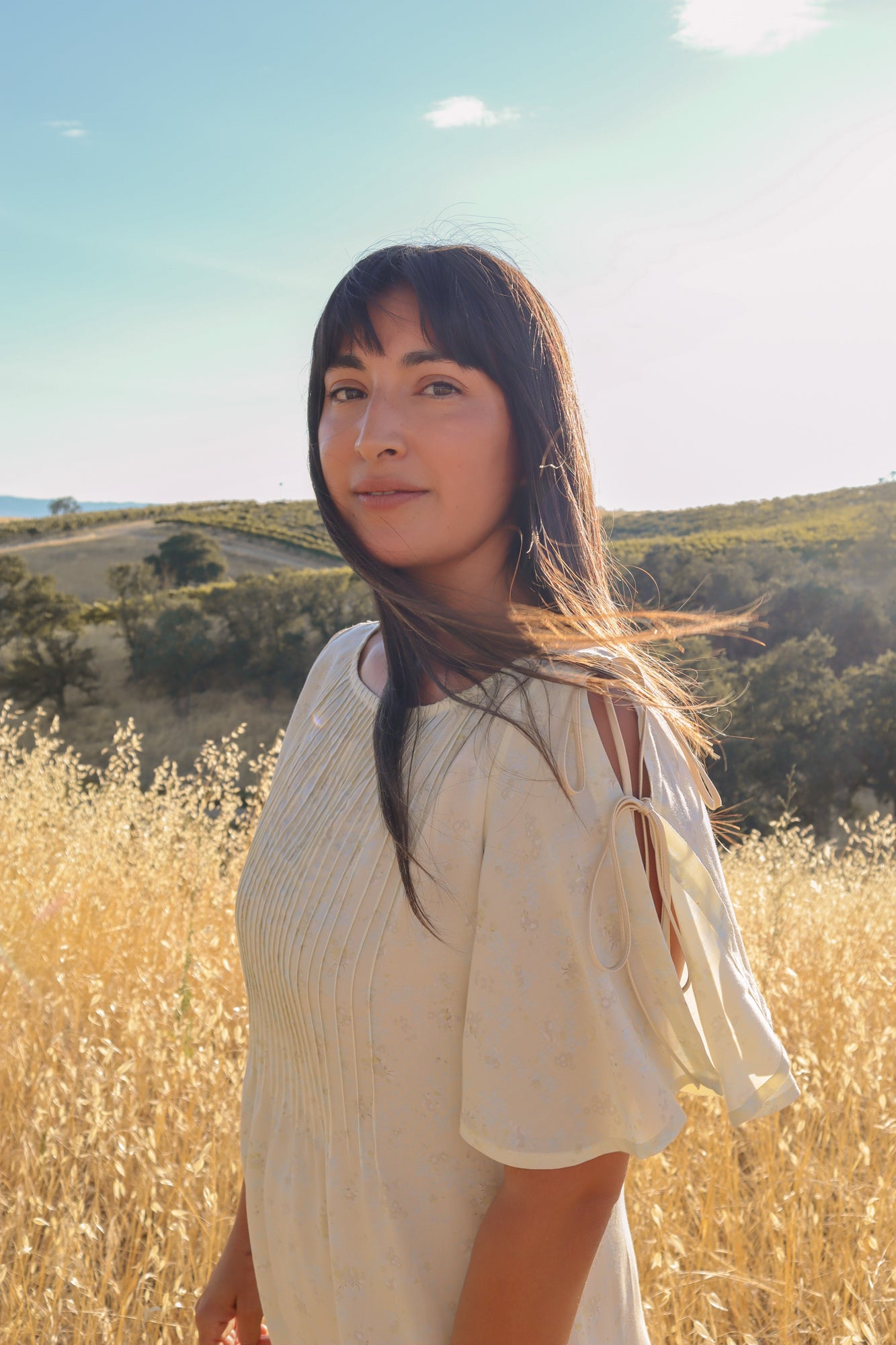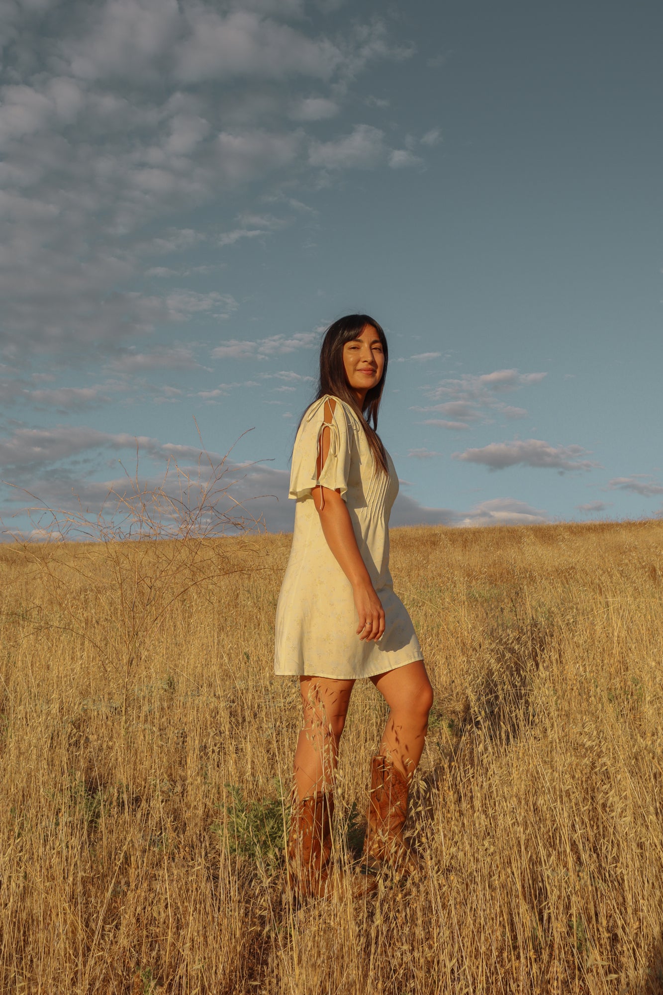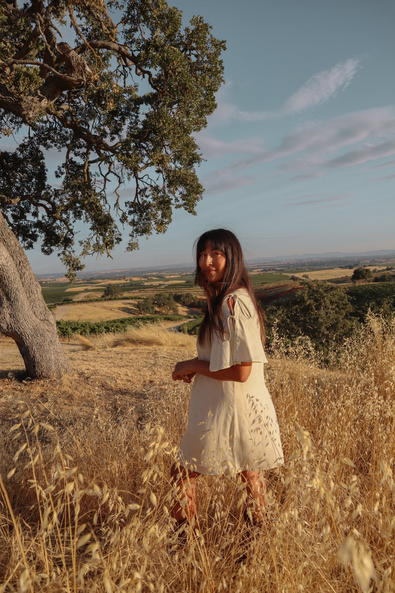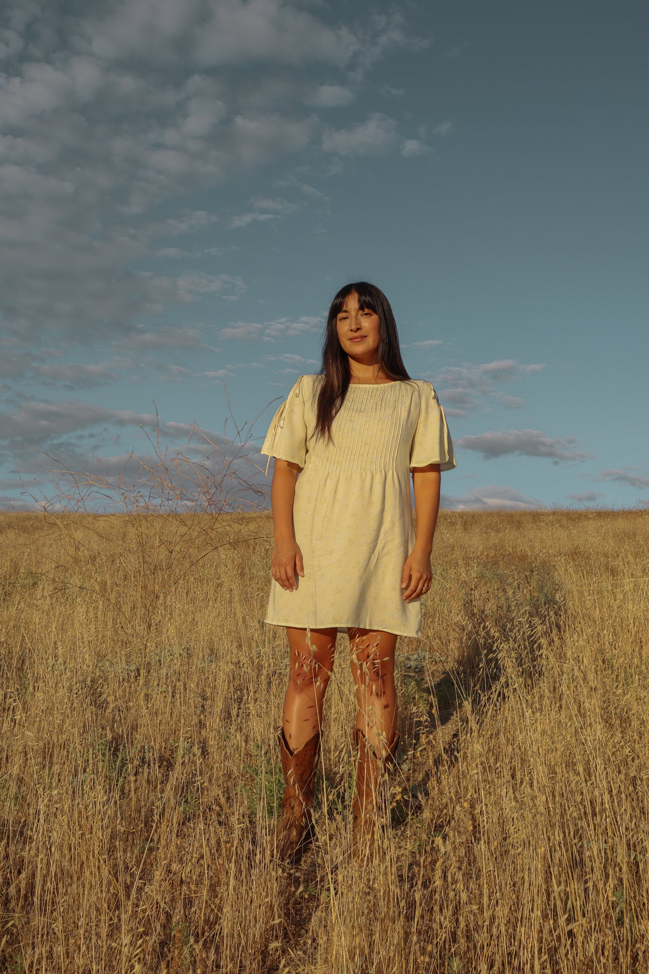 Our beloved Mae dress in a light, floral, cotton and silk blend. Fabric is best represented in first and third photo. Other photos the fabric has darker golden reflections from the sunset. Pleated, sewn, detailing and details shoulder ties will certainly make you the talk of cocktail hour. Ethically & sustainably handmade in LA. Fabric is a cotton and silk blend. This version of the Mae dress is more sheer, Olivia is wearing a slip underneath.